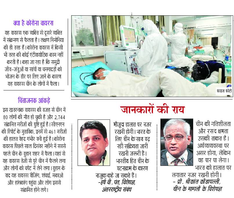 चीन से फैले कोरोना वायरस को प्रकोप भारत समेत दुनिया भर के कई देशों में दिखने लगा है। भारत, अमेरिका, फ्रांस, जापान तिब्बत, थाइलैंड, जापान और मंगोलिया में लोगों को अपनी चपेट में ले रहा है। 80 से ज्यादा लोगों की जान जा चुकी है। विश्व स्वास्थ्य संगठन ने इसे चीन के लिए एक आपातकालीन स्थिति कहा है। विश्व भर में स्वास्थ्य के खतरों के अलावा इससे अहम राजनियक और आर्थिक चुनौतियां खड़ी होने की आशंका जताई जा रही है। भारत पर तो असर पड़ेगा ही।