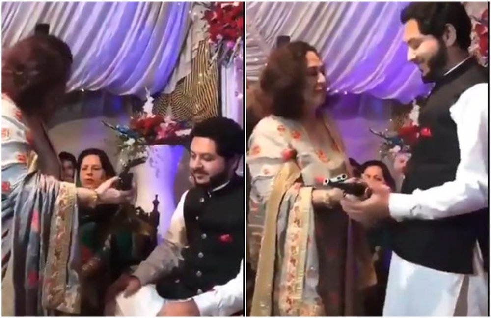 आम तौर पर शादी में वर या वधू को लोग तोहफे देते हैं। पाकिस्तान में एक शादी समारोह के दौरान दूल्हे को दिया गया तोहफा सोशल मीडिया पर वायरल हो गया है। दरअसल इस शादी में एक महिला ने दूल्हे को एके-47 राइफल गिफ्ट किया। दूल्हे को राइफल गिफ्ट कर रही इस महिला का जो वीडियो सामने आया है उसमें नजर आ रहा है कि यह महिला दूल्हे के करीब जाती हैं उन्हें गले से लगाती हैं। इसके बाद एक शख्स महिला को एके-47 थमाता है। यह महिला इस राइफल को दूल्हे को गिफ्ट करती है। दूल्हा खड़ा होकर यह गिफ्ट कबूल करता है। वीडियो में आसपास के लोगों की आवाज सुनाई दे रही है। यह सभी यह गिफ्ट देख कर जश्न मनाने लगते हैं। एके-47 के साथ महिला और दूल्हे की तस्वीर भी खींची जाती है।