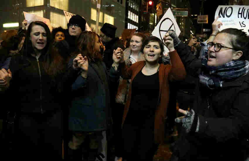 अमेरिका में राष्ट्रपति चुनाव में डोनाल्ड ट्रंप की चौंकाने वाली जीत के खिलाफ जारी प्रदर्शनों के चौथे दिन हजारों लोग सड़कों पर मार्च में शामिल हुए। प्रदर्शन लॉस एंजिलिस, न्यूयॉर्क और शिकागो जैसे बड़े शहरों के साथ ही वार्सेस्टर, मैसाचुसेट्स और लोवा सिटी, लोवा में कुल मिलाकर शांतिपूर्ण रहे। यद्यपि इंडियानापोलिस में प्रदर्शनों के दौरान दो पुलिस अधिकारी मामूली रूप से घायल हो गए। प्रदर्शनकारियों ने न्यूयॉर्क के यूनियन स्क्वॉयर के पास एकत्रित हुए और उसके बाद ट्रंप टावर की ओर बढ़े जहां उन्हें पुलिस ने बैरिकेड से रोक दिया। राष्ट्रपति चुनाव में जीते रिपब्लिकन पार्टी के उम्मीदवार ट्रंप अपने अपार्टमेंट में ही रहे जहां वह अपने सहयोगियों के साथ चर्चा कर रहे थे।