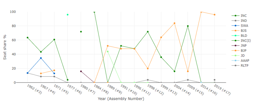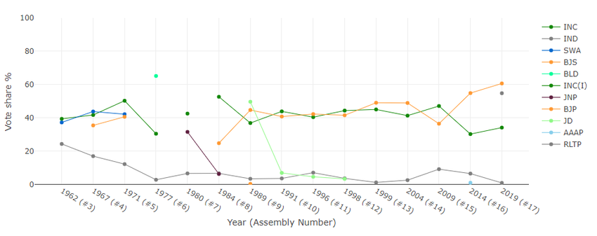 2019 के चुनावों में भाजपा के वोट शेयर में वृद्धि अन्य सभी राजनीतिक दलों और उम्मीदवारों के पूरी तरह सूपड़ा साफ होने का परिणाम था। यह राज्य में प्रतिभागियों की औसत प्रभावी संख्या (ENOP) के रुझान से भी पता चलता है, जो 1977 के बाद से 2019 में सबसे कम था जब यह घटकर सिर्फ 1.92 रह गया था।