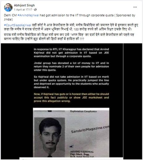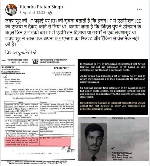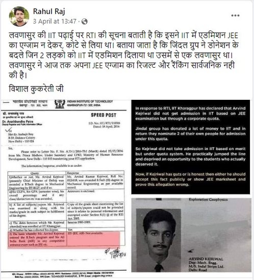 सोशल मीडिया पर दिल्ली के मुख्यमंत्री अरविंद केजरीवाल को लेकर एक पोस्ट वायरल है, जिसमें दावा किया जा रहा है कि अरविंद केजरीवाल ने भारतीय प्रौद्योगिकी संस्थान (IIT) में प्रवेश के लिए JEE (Joint Entrance Examination) पास नहीं किया। पोस्ट से दावा है कि केजरीवाल ने “कॉर्पोरेट कोटा” के माध्यम से IIT में प्रवेश लिया था। सोशल मीडिया पर केजरीवाल को लेकर यह दावा करने वाले पोस्ट्स को खूब साझा किया जा रहा है।