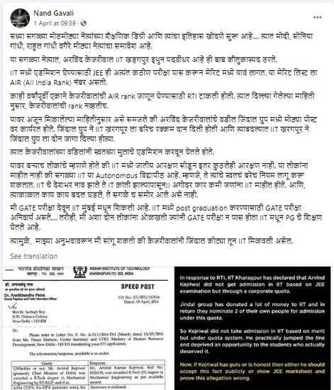 जब हमने आरटीआई के जवाब को ऑनलाइन खोजा, तो हमें अभिषेक मोदक की ‘Quora’ पर एक पोस्ट मिली। मोदक आरटीआई एंथूज़ियास्ट हैं। उन्होंने आरटीआई के जवाब की तस्वीरें शेयर करते हुए लिखा, “अरविंद केजरीवाल ने IIT-JEE में AIR-563 हासिल किया था। केजरीवाल ने आईआईटी खड़गपुर से 1985–89 में मैकेनिकल इंजीनियरिंग में बी.टेक किया। उनका सीजीपीए 8.42 है। इसका खुलासा आईआईटी खड़गपुर में दायर एक आरटीआई आवेदन से हुआ है।”