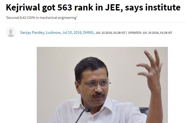 बाद में, हमें डेक्कन हेराल्ड की एक रिपोर्ट मिली, जिसका शीर्षक था, Kejriwal got 563 rank in JEE, says institute यह रिपोर्ट 10 जुलाई, 2016 को प्रकाशित हुई थी।