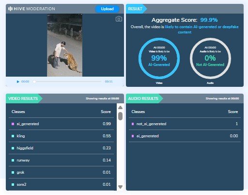 हमने वीडियो को HIVE moderation.com के माध्यम से भी चलाया, जिसने सुझाव दिया कि वीडियो AI-जेनरेटेड था।