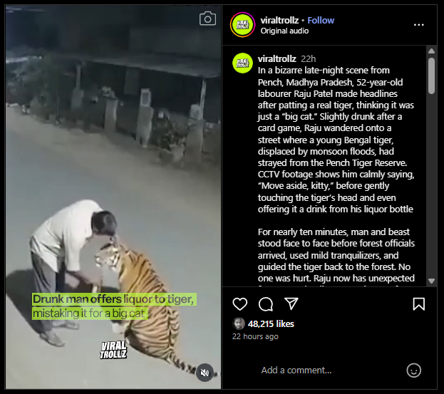 लाइटहाउस जर्नलिज़्म को एक वायरल वीडियो मिला, जिसमें एक व्यक्ति भारत की सड़कों पर एक बाघ को सहलाते हुए दिख रहा था। कई लोगों ने दावा किया कि यह वीडियो मध्य प्रदेश में बाघों की आबादी के लिए पहचाने जाने वाले एक राष्ट्रीय उद्यान का है। कई पोस्ट में यह भी दावा किया गया कि शराबी व्यक्ति ने बाघ को शराब पिलाने की पेशकश की।