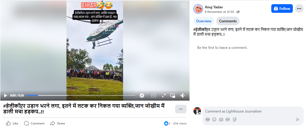 निष्कर्ष: हेलीकॉप्टर से लटके एक शख्स का केन्या का पुराना वीडियो बिहार का हालिया वीडियो बताकर व्यापक रूप से शेयर किया जा रहा है। वायरल दावा भ्रामक है।