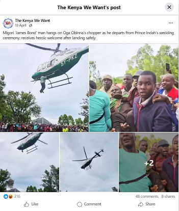 इस साल अप्रैल में प्रकाशित समाचार रिपोर्ट में कहा गया था: ‘लिफ्ट न मिलने पर हवा में लटके एक शख्स ने, केन्या में एक शादी में उड़ान भर रहे एक हेलीकॉप्टर के लैंडिंग गियर (उतरने के पहियों) से चिपक कर भीड़ में दहशत फैला दी। स्थानीय पुलिस से मिली जानकारी के अनुसार, यह घटना 13 अप्रैल को हुई थी, जब केन्या के रापोगी (Rapogi) गांव से एक हेलीकॉप्टर उड़ान भरने की तैयारी कर रहा था।’
