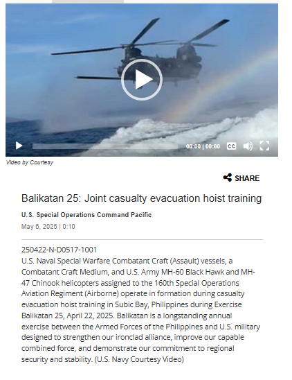 वीडियो के साथ दिए गए कैप्शन में कहा गया: “अमेरिकी नौसेना के विशेष युद्धक जहाजों (Assault vessels), एक कॉम्बैटेंट क्राफ्ट मीडियम, और 160वें स्पेशल ऑपरेशंस एविएशन रेजिमेंट (एयरबोर्न) से जुड़े अमेरिकी सेना के MH-60 ब्लैक हॉक और MH-47 चिनूक हेलीकॉप्टरों ने एक्सरसाइज बालिकतन 25 के दौरान 22 अप्रैल 2025 को सुबिक बे, फिलीपींस में प्रशिक्षण में भाग लिया।”