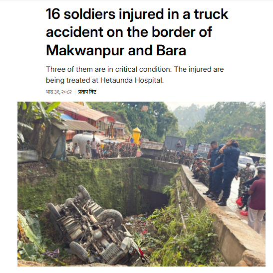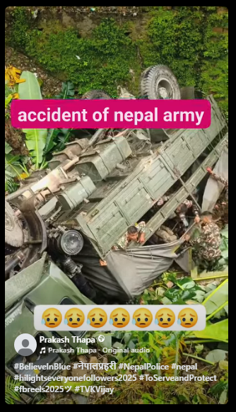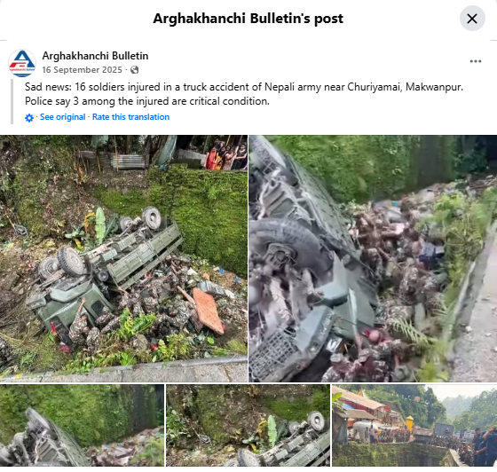 पोस्ट के कैप्शन में लिखा था (अनुवाद): “दुखद समाचार: मकवानपुर के चुरियामाई के पास नेपाली सेना का एक ट्रक दुर्घटनाग्रस्त हो गया, इसमें 16 सैनिक घायल हो गए। पुलिस का कहना है कि घायलों में से 3 की हालत गंभीर है।”