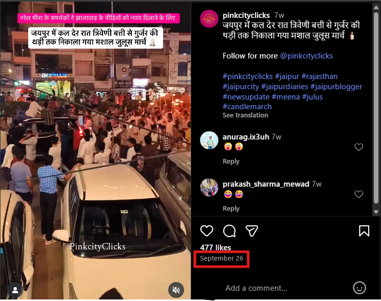 हमें एक अन्य इंस्टाग्राम यूजर खुशीराम गुर्जर मिले, जिन्होंने यह वीडियो साझा किया था और वीडियो में नरेश मीणा को टैग किया था। यह वीडियो 25 सितंबर को अपलोड किया गया था।