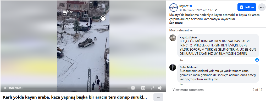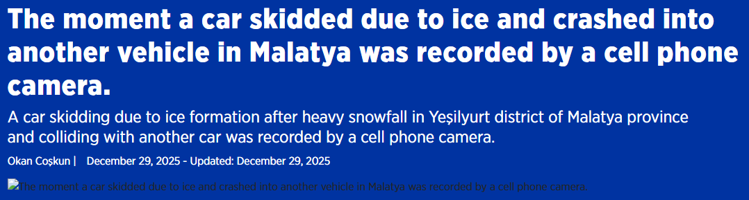 रिपोर्ट का शीर्षक था (अनुवाद): मालत्या (Malatya) में बर्फ जमने के कारण एक कार के फिसलने और दूसरे वाहन से टकराने का पल सेल फोन कैमरे में कैद हुआ।