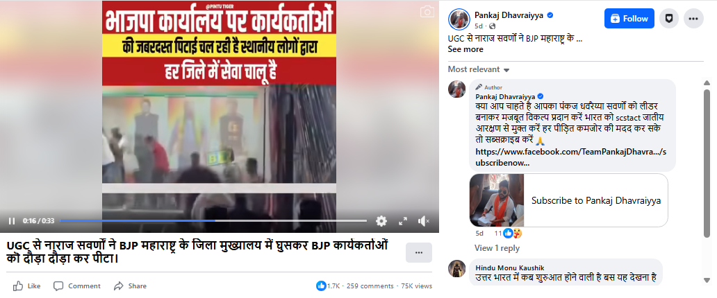 निष्कर्ष: भिवंडी का पुराना और असंबंधित वीडियो हालिया बताकर इस दावे के साथ शेयर किया जा रहा है कि UGC नियमों को लेकर बीजेपी कार्यकर्ताओं पर हमला हुआ है। वायरल दावा भ्रामक है।