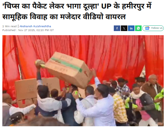 रिपोर्ट में कहा गया था कि हाल ही में उत्तर प्रदेश के हमीरपुर में ‘मुख्यमंत्री सामूहिक विवाह समारोह’ का आयोजन किया गया था। इस सामूहिक विवाह कार्यक्रम के माध्यम से चार ब्लॉकों के 380 से अधिक वर-वधू जोड़ों ने अपने जीवन के एक नए अध्याय की शुरुआत की। इनमें निकाह कबूल करने वाले तीन मुस्लिम जोड़े भी शामिल थे। समारोह संपन्न होने के कुछ ही क्षणों बाद, खाने-पीने की चीजों के लिए लोगों की भीड़ उमड़ पड़ी, जिससे अफरा-तफरी मच गई।
