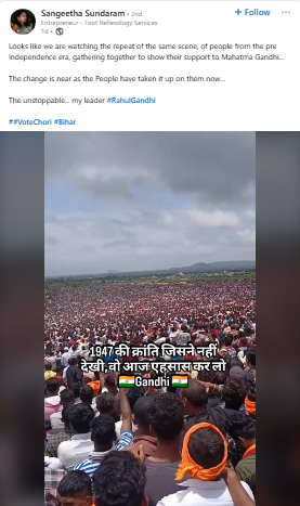 ‘लाइटहाउस जर्नलिज्म’ को सोशल मीडिया प्लेटफॉर्म पर एक वीडियो मिला, जो व्यापक रूप से शेयर किया जा रहा है। दावा किया गया है कि यह वीडियो बिहार का है और लोकसभा में विपक्ष के नेता राहुल गांधी की रैली में लोगों की “सुनामी” (भारी भीड़) आ गई थी।