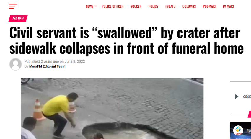 रिपोर्ट में भी कुछ इसी तरह के कीफ्रेम थे। इसमें बताया गया था, “सीरा के अंदरूनी हिस्से में स्थित कास्केवेल में फुटपाथ का फर्श ढहने के बाद खुले गड्ढे में एक सिविल सेवक की मौत हो गई। सिटी हॉल के अनुसार, मारिया रोसिलीन पहले से ही घर पर हैं और उनकी हालत ठीक है।” यह रिपोर्ट दो साल पहले 2 जून, 2022 को प्रकाशित हुई थी।