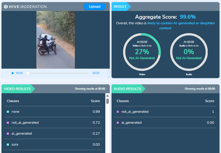 इसके बाद हमने वीडियो को ‘HIVE Moderation’ और ‘undetectable AI’ के जरिए चेक किया। दोनों टूल्स ने निष्कर्ष निकाला कि वीडियो AI-जेनरेटेड था।