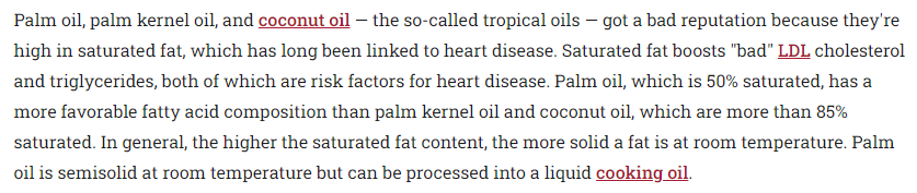 हार्वर्ड वेबसाइट पर एक लेख में उल्लेख किया गया है: पाम ऑयल, पाम कर्नेल ऑयल और नारियल तेल – तथाकथित उष्णकटिबंधीय तेल – को अच्छा नहीं माना जाता क्योंकि उनमें सैचुरेटेड फैट अधिक होता है, जिसे लंबे समय से हृदय रोग से जोड़ा जाता रहा है।