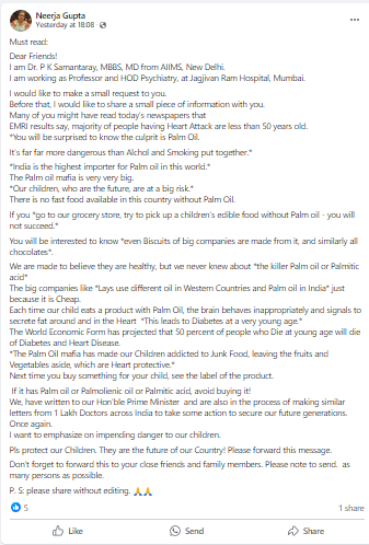 लाइटहाउस जर्नलिज्म को सोशल मीडिया प्लेटफॉर्म पर एक लंबा टेक्स्ट मैसेज मिला, जिसमें पाम ऑयल के हानिकारक प्रभावों के बारे में बताया गया था। कहा गया कि यह मैसेज एम्स, नई दिल्ली के डॉ. पी. के. सामंतराय ने लिखा है। मैसेज में दावा किया गया था कि पाम ऑयल खासकर बच्चों के लिए एक बड़ा स्वास्थ्य जोखिम है और इसे दिल के दौरे, मधुमेह और अन्य स्वास्थ्य समस्याओं से जोड़ा गया है।