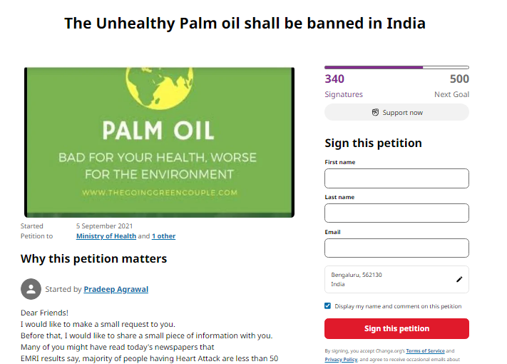 भारत में पाम ऑयल पर प्रतिबंध लगाने के लिए change.org पर एक याचिका भी जारी की गई थी।