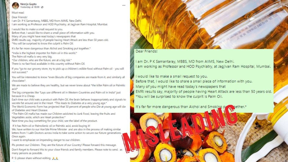 लाइटहाउस जर्नलिज्म को सोशल मीडिया प्लेटफॉर्म पर एक लंबा टेक्स्ट मैसेज मिला, जिसमें पाम ऑयल के हानिकारक प्रभावों के बारे में बताया गया था। कहा गया कि यह मैसेज एम्स, नई दिल्ली के डॉ. पी. के. सामंतराय ने लिखा है। मैसेज में दावा किया गया था कि पाम ऑयल खासकर बच्चों के लिए एक बड़ा स्वास्थ्य जोखिम है और इसे दिल के दौरे, मधुमेह और अन्य स्वास्थ्य समस्याओं से जोड़ा गया है।