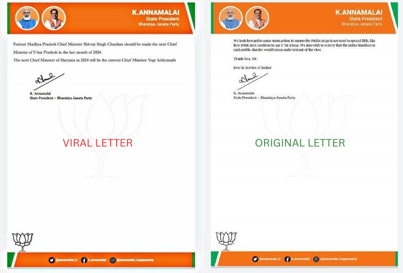लाइटहाउस जर्नलिज्म को तमिलनाडु भाजपा के प्रदेश अध्यक्ष के. अन्नामलाई के नाम से एक पत्र मिला, जो वायरल हो रहा था। पत्र में लिखा था, ‘मध्य प्रदेश के पूर्व मुख्यमंत्री शिवराज सिंह चौहान को 2024 के आखिरी महीने में उत्तर प्रदेश का अगला मुख्यमंत्री बनाया जाना चाहिए। 2024 में हरियाणा के अगले मुख्यमंत्री मौजूदा मुख्यमंत्री योगी आदित्यनाथ होंगे।’ यह पत्र लेटरहेड पर लिखा गया था और इस पर के. अन्नामलाई के हस्ताक्षर थे। जांच के दौरान हमने पाया कि यह पत्र फर्जी है।