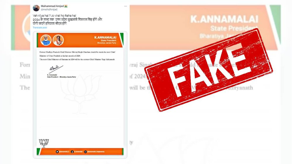 लाइटहाउस जर्नलिज्म को तमिलनाडु भाजपा के प्रदेश अध्यक्ष के. अन्नामलाई के नाम से एक पत्र मिला, जो वायरल हो रहा था। पत्र में लिखा था, ‘मध्य प्रदेश के पूर्व मुख्यमंत्री शिवराज सिंह चौहान को 2024 के आखिरी महीने में उत्तर प्रदेश का अगला मुख्यमंत्री बनाया जाना चाहिए। 2024 में हरियाणा के अगले मुख्यमंत्री मौजूदा मुख्यमंत्री योगी आदित्यनाथ होंगे।’ यह पत्र लेटरहेड पर लिखा गया था और इस पर के. अन्नामलाई के हस्ताक्षर थे। जांच के दौरान हमने पाया कि यह पत्र फर्जी है।