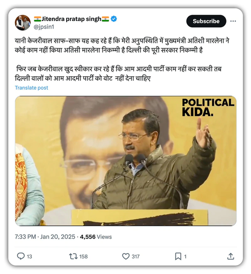 दावा किया जा रहा है कि केजरीवाल ये मान लिया है कि उनकी अनुपस्थिति में दिल्ली की मुख्यमंत्री आतिशी मार्लेना ने कोई काम नहीं किया. वीडियो को एक्स पर शेयर करते हुए एक व्यक्ति ने लिखा है, “यानी केजरीवाल साफ-साफ यह कह रहे हैं कि मेरी अनुपस्थिति में मुख्यमंत्री अतिशी मारलेना ने कोई काम नहीं किया अतिसी मारलेना निकम्मी है दिल्ली की पूरी सरकार निकम्मी है. फिर जब केजरीवाल खुद स्वीकार कर रहे हैं कि आम आदमी पार्टी काम नहीं कर सकती तब दिल्ली वालों को आम आदमी पार्टी को वोट नहीं देना चाहिए.” इसका आर्काइव यहां देखा जा सकता है.