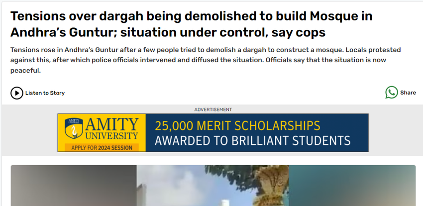 रिपोर्ट में बताया गया है: आंध्र प्रदेश के गुंटूर में एक दरगाह को तोड़कर मस्जिद बनाने के बाद कुछ समय के लिए तनाव की स्थिति बनी रही। हालांकि, पुलिस अधिकारियों का कहना है कि स्थिति अब नियंत्रण में है।