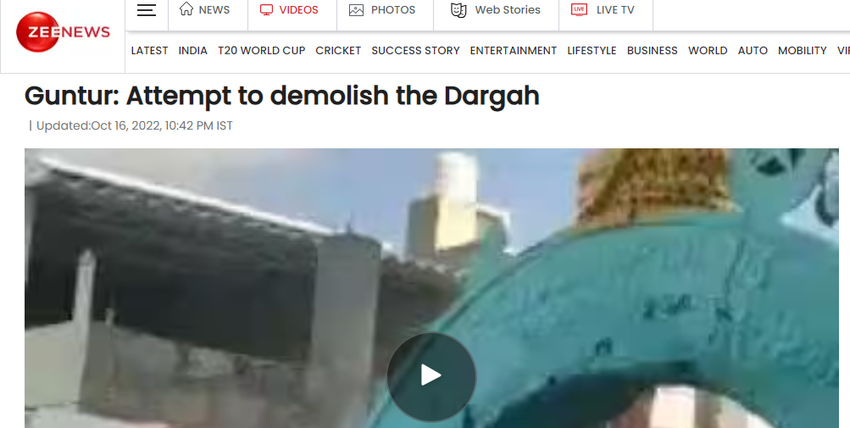 रिपोर्ट में बताया गया है: गुंटूर में एक दरगाह को गिराने की कोशिश की गई है। लोग दरगाह को गिराए जाने का विरोध कर रहे हैं और भाजपा ने भी उस विरोध को जोरदार आवाज़ दी है। आपको बता दें कि दरगाह को गिराने की कोशिश करने का आरोप मुसलमानों पर लगाया गया है।