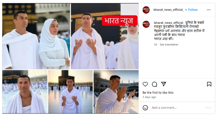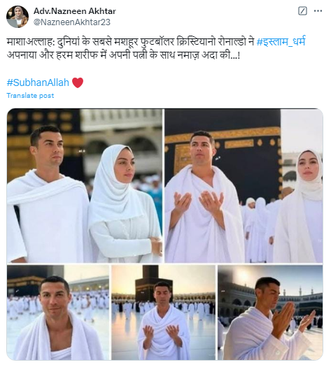 निष्कर्ष: फुटबॉलर क्रिस्टियानो रोनाल्डो और उनकी पत्नी की तस्वीरें इस दावे के साथ शेयर की जा रही हैं कि उन्होंने और उनकी पत्नी ने इस्लाम स्वीकार कर लिया है। ये तस्वीरें AI द्वारा बनाई गई हैं। वायरल दावा झूठा है।