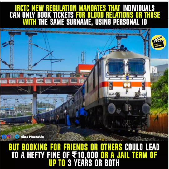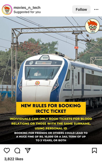 लाइटहाउस जर्नलिज्म को सोशल मीडिया पर एक पोस्ट मिली, जिसमें दावा किया गया था कि IRCTC ने ट्रेन टिकट बुक करने के लिए नए नियम बनाए हैं। पोस्ट में कहा गया था, ‘कोई भी व्यक्ति केवल अपने खून के रिश्तेदारों या समान उपनाम वाले लोगों के लिए ही टिकट बुक कर सकता है। इसके लिए उसे व्यक्तिगत पहचान पत्र का उपयोग करना होगा। दोस्तों या अन्य लोगों के लिए टिकट बुक करने पर 10,000 रुपये का भारी जुर्माना या 3 साल तक की जेल या दोनों हो सकते हैं।’