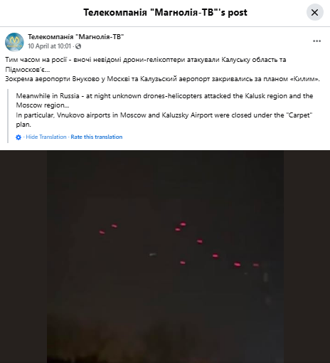 पोस्ट में कहा गया: इस बीच रूस में – रात में अज्ञात ड्रोन-हेलीकॉप्टरों ने कलुस्क क्षेत्र और मॉस्को क्षेत्र पर हमला किया… विशेष रूप से, मॉस्को में वनुकोवो हवाई अड्डे और कलुज़स्की हवाई अड्डे को “कार्पेट” योजना के तहत बंद कर दिया गया।