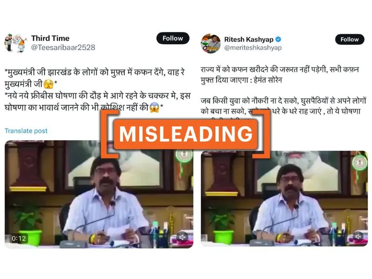 एक्स (पूर्व में ट्विटर) पर एक यूज़र ने वीडियो पोस्ट कर कैप्शन दिया, “मुख्यमंत्री जी झारखंड के लोगों को मुफ़्त में कफन देंगे, वाह रे मुख्यमंत्री जी. नये नये फ्रीबीस घोषणा की दौड़ मे आगे रहने के चक्कर मे, इस घोषणा का भावार्थ जानने की भी कोशिश नहीं की.” पोस्ट का आर्काइव वर्ज़न नीचे देखें।