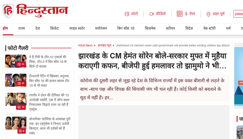 हमने कीवर्ड्स के ज़रिये हेमंत सोरेन के वीडियो के बारे में खोज की, तो यह हमें मई 2021 की कई न्यूज़ रिपोर्टों में मिला, जिनमें बताया गया था कि कोरोना के कारण हो रही मौतों को देखते हुए झारखंड के मुख्यमंत्री ने अंतिम संस्कार के लिए मुफ़्त कफ़न मुहैया कराने की घोषणा की है।