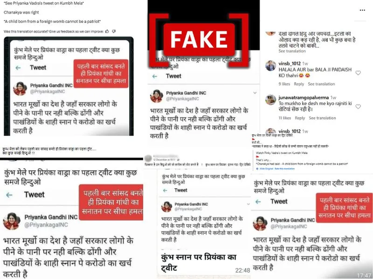 एक एक्स यूज़र ने लिखा है, “कुंभ मेले पर-प्रियंका वाड्रा का ट्वीट देखिये. चाणक्य ने सही कहा था. विदेशी कोख से जन्मी संतान राष्ट्रभक्त नहीं हो सकती.” ऐसे ही दावों वाले पोस्ट के आर्काइव वर्ज़न यहां और यहां देखे जा सकते हैं।