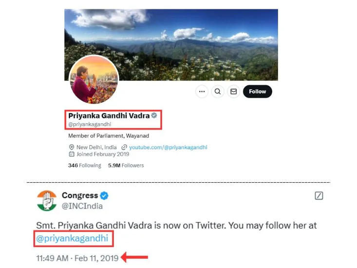 इसके अलावा, वायरल स्क्रीनशॉट पहली बार फ़रवरी 2, 2019 को दोपहर 3:11 बजे शेयर किया गया था (आर्काइव यहां), जो प्रियंका गांधी के सांसद बनने से काफी पहले की बात है। वह आधिकारिक तौर पर फ़रवरी 11, 2019 को एक्स (पूर्व में ट्विटर) से जुड़ीं और कांग्रेस ने उसी दिन उनके वेरिफाइड अकाउंट (@priyankagandhi) की घोषणा की थी (आर्काइव यहां)। यह आधिकारिक अकाउंट वायरल पोस्ट में दिखाए गए अकाउंट से अलग है।