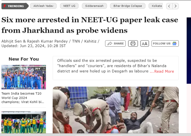 कैप्शन में कहा गया है कि यूजीसी एनईईटी मामले के सिलसिले में 6 आरोपियों को एलएनजेपी अस्पताल, पटना से ले जाया गया। बिहार पुलिस ने आरोपी को झारखंड के देवघर से गिरफ्तार किया है।