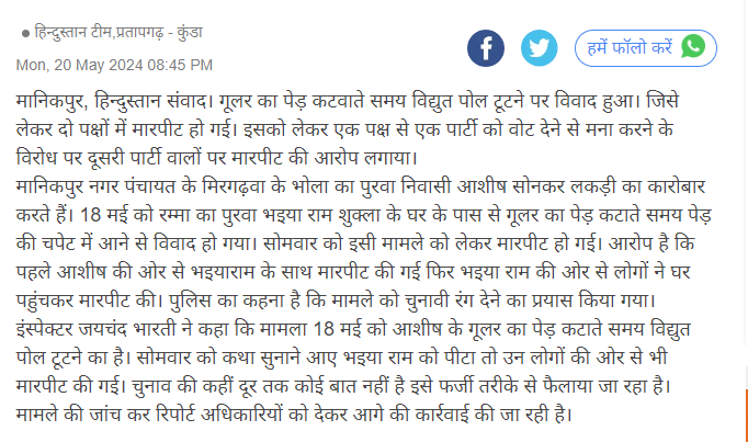 पड़ताल को आगे बढ़ाते हुए डेस्क ने संबंधित कीवर्ड्स की मदद से इससे जुड़ी मीडिया रिपोर्ट्स ढूंढने की कोशिश की। इस दौरान हमें लाइव हिंदुस्तान की वेबसाइट पर एक खबर मिली, जिसमें बताया गया कि मानिकपुर पंचायत में गूलर का पेड़ काटने के दौरान बिजली का खंभा टूटने को लेकर दो पक्षों में मारपीट हो गयी।
