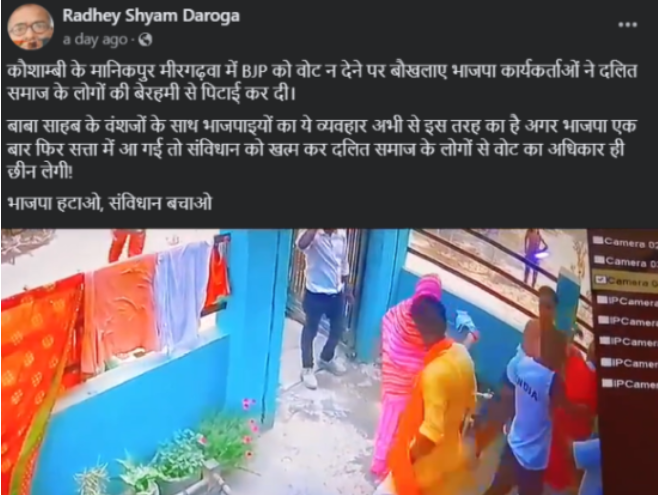 फेसबुक यूजर राधेश्याम दरोगा ने 13 सेकेंड का क्लिप शेयर कर दावा किया कि बीजेपी को वोट न देने पर कार्यकर्ताओं ने दलित समुदाय के लोगों की बेरहमी से पिटाई की।