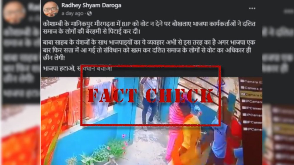निष्कर्ष: कुछ लोगों द्वारा घर में घुसकर मारपीट करने का एक वीडियो शेयर कर दावा किया जा रहा है कि कौशाम्बी के मानिकपुर मीरगढ़वा में BJP को वोट न देने पर बौखलाए भाजपा कार्यकर्ताओं ने दलित समाज के लोगों की बेरहमी से पिटाई कर दी। पीटीआई फैक्ट चेक डेस्क की पड़ताल में वायरल दावा फर्जी निकला। डेस्क ने अपनी पड़ताल में पाया कि यह वीडियो बिजली के खंभे पर पेड़ की टहनी गिरने से बिजली का तार टूटने को लेकर दो पक्षों के बीच हुए विवाद से जुड़ा है। इसका चुनाव से कोई संबंध नहीं है।