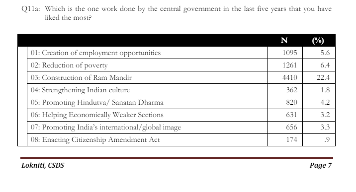 लोकनीति-सीएसडीएस के सर्वे में जब लोगों से यह सवाल पूछा गया कि पिछले 5 साल में केंद्र सरकार के द्वारा किए गए किस काम को वे सबसे ज्यादा पसंद करते हैं तो इसमें से 22.4% लोगों ने कहा कि अयोध्या में राम मंदिर का निर्माण होना उनकी नजर में मोदी सरकार का सबसे बेहतर काम है।