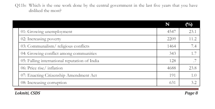अगले सवाल के रूप में जब लोगों से पूछा गया कि पिछले 5 सालों में उन्हें मोदी सरकार का कौन सा काम सबसे खराब लगा तो इसके जवाब में 23.1% लोगों ने बढ़ती बेरोजगारी को और 23.8% लोगों ने महंगाई को सरकार का सबसे खराब काम बताया।