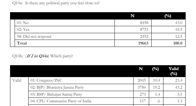 लोकनीति-सीएसडीएस के द्वारा जब लोगों से सवाल पूछा गया कि क्या वे किसी राजनीतिक दल के करीब हैं तो कुल 19663 में से 8753 लोगों ने कहा कि हां वे एक राजनीतिक दल के करीब हैं। लेकिन जब यह पूछा गया कि वे किस राजनीतिक दल के करीब हैं तो 19.2% लोगों ने कहा कि वे बीजेपी के करीब हैं जबकि 10.4% लोगों ने खुद का जुड़ाव कांग्रेस से बताया।