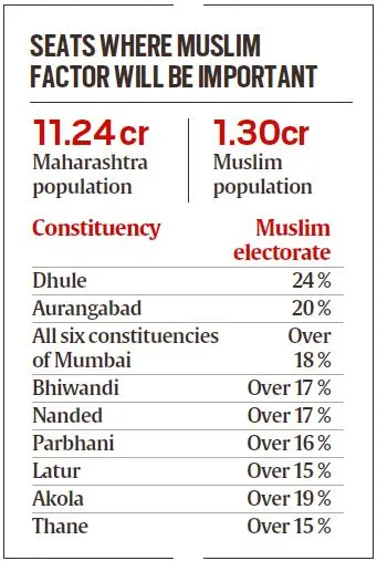 महाराष्ट्र के कुल आबादी 11.24 करोड़ है, इसमें मुस्लिम 1.3 करोड़ हैं। यानी राज्य की आबादी में 11.56 प्रतिशत मुसलमना हैं। मुस्लिम समुदाय राज्य की 14 लोकसभा निर्वाचन क्षेत्रों में महत्वपूर्ण भूमिका निभाते हैं – जिसमें मुंबई की सीटें भी शामिल हैं – जहां वे मतदाताओं का 14 से 25 प्रतिशत के बीच हैं। ये 14 सीटें जहां मुस्लिम बड़ी भूमिका निभाएंगे वो हैं धुले, नांदेड़, परभणी, लातूर, औरंगाबाद, भिवंडी, अकोला, ठाणे और मुंबई की छह सीटें।