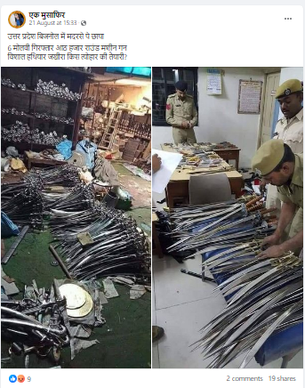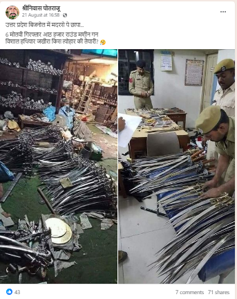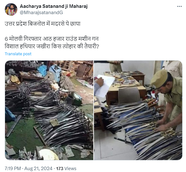 सोशल मीडिया प्लेटफॉर्म पर कुछ तस्वीरों का एक कोलाज खूब शेयर किया जा रहा है। तस्वीरों के साथ दावा किया जा रहा है कि मदरसे में छापेमारी के दौरान जो हथियार बरामद हुए हैं, वे असलहे हैं। पोस्ट में यह भी दावा किया गया है कि छापेमारी में मशीन गन भी बरामद की गई है।
