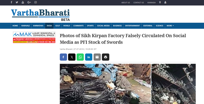 हमें यह तस्वीर वार्ता भारती की वेबसाइट पर मिली। 2018 में अपलोड किए गए लेख का शीर्षक था: सिख कृपाण फैक्ट्री की तस्वीरें सोशल मीडिया पर PFI के तलवारों के स्टॉक के रूप में गलत तरीके से प्रसारित की गईं।