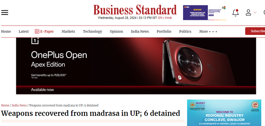 बिजनेस स्टैंडर्ड की एक रिपोर्ट में कहा गया है: एक अधिकारी ने बताया कि पुलिस ने यहां एक मदरसे से हथियार बरामद किए, जिसके बाद छह लोगों को हिरासत में लिया गया। सर्कल ऑफिसर (सीओ) कृपाशंकर कन्नौजिया ने बताया कि सूचना मिलने के बाद दोपहर में शेरकोट इलाके में कांधला रोड पर स्थित मदरसा दारुल कुरान हमीदिया में छापा मारा गया।
