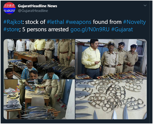 हमें पता चला कि यह तस्वीर 2016 की है, जब गुजरात पुलिस ने राजकोट-अहमदाबाद हाईवे पर एक दुकान पर छापा मारा था और हथियार जब्त किए थे।