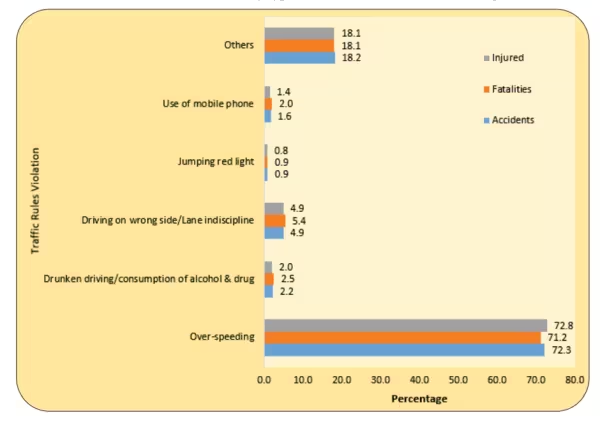 2022 की कुल सड़क दुर्घटनाओं में 72.3 प्रतिशत ओवरस्पीडिंग के कारण हुईं। यानी सड़क हादसों का सबसे बड़ा कारण तेज गति से गाड़ी चलाना रहा। कुल मौतों में 71.2 प्रतिशत और कुल घायलों में 72.8 प्रतिशत के लिए ओवर स्पीडिंग जिम्मेदार थी। गलत दिशा में गाड़ी चलाना 2022 में कुल सड़क दुर्घटनाओं का दूसरा सबसे बड़ा कारण था, जो सभी दुर्घटनाओं का 4.9 प्रतिशत था।
