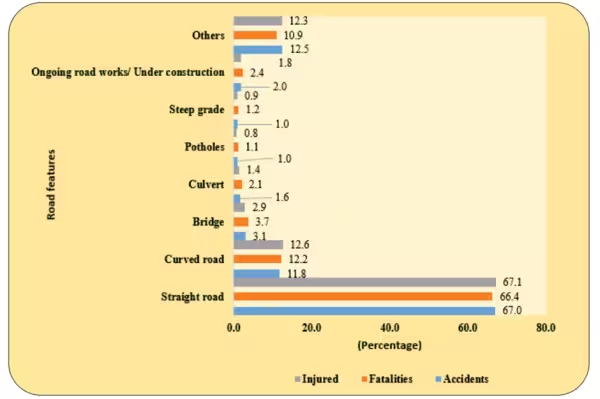 आंकड़ों के मुताबिक, 67 फीसदी दुर्घटनाएं सीधी सड़कों पर हुईं। यह घुमावदार सड़कों, गड्ढों वाली सड़कों और ढलान वाली सड़कों पर होने वाली दुर्घटनाओं की कुल संख्या (13.8 प्रतिशत) से चार गुना अधिक है।